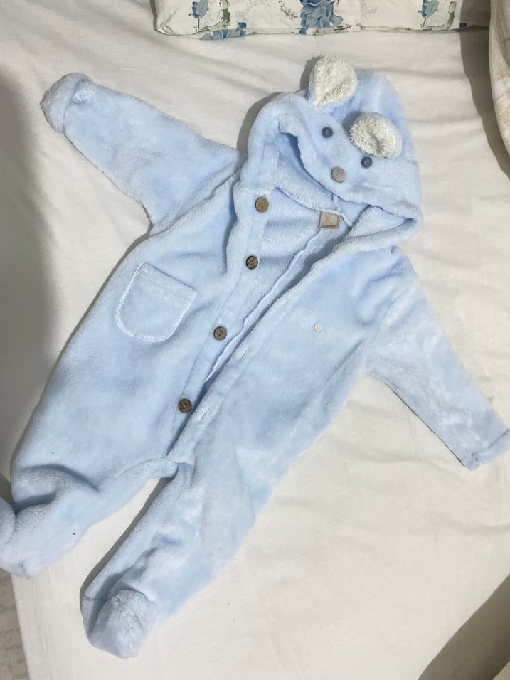 Pastel mavi, yumuşak ve sıcak kumaştan yapılmış, kulaklı kapüşon ve kürk detaylı bebek tulumu. Düğmeli kapama ve küçük cepli.