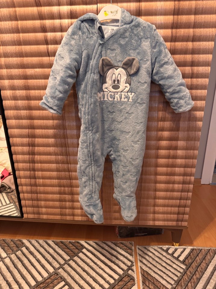 Mavi renkli, yumuşak ve sıcak peluş kumaştan yapılmış, Mickey baskılı ve kürklü detaylara sahip bebek tulumu. Sokak stili tasarım içerir. ❄️