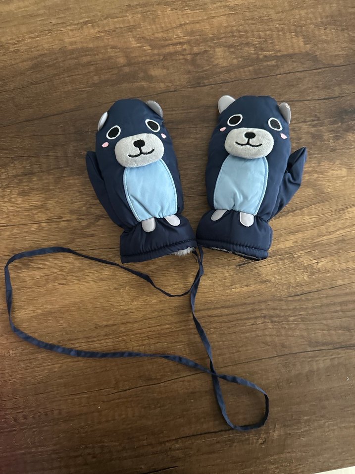 Yumuşak kumaş ve peluş detaylı, mavi renkli çocuk eldivenleri. Oyuncu ayı tasarımı ve ip bağlantısı bulunur.