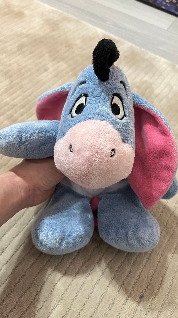 Yumuşak pastel mavi peluş eşek oyuncak, pembe kulak içleri ve siyah tepesi ile sarılmak için ideal. Orjinal ürün .