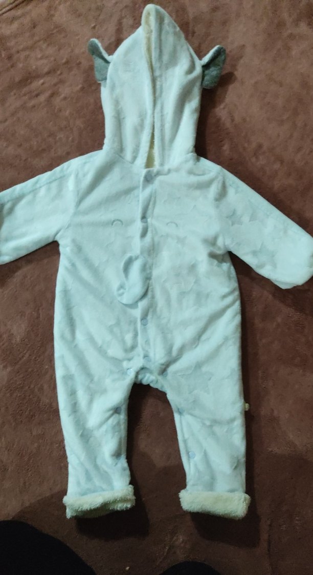 Peluş kumaştan yapılmış, mavi renkte erkek bebek tulumu. Kürklü detaylar ve kapüşonlu tasarım içerir, sokak stiline uygundur.