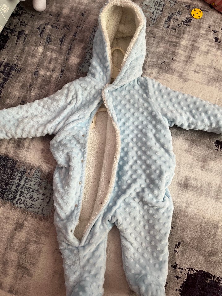 Peluş dokulu, kapüşonlu mavi erkek bebek tulumu, kürk detaylı ve yumuşak dokulu. Rahatlık için kabartmalı yüzeye sahip.