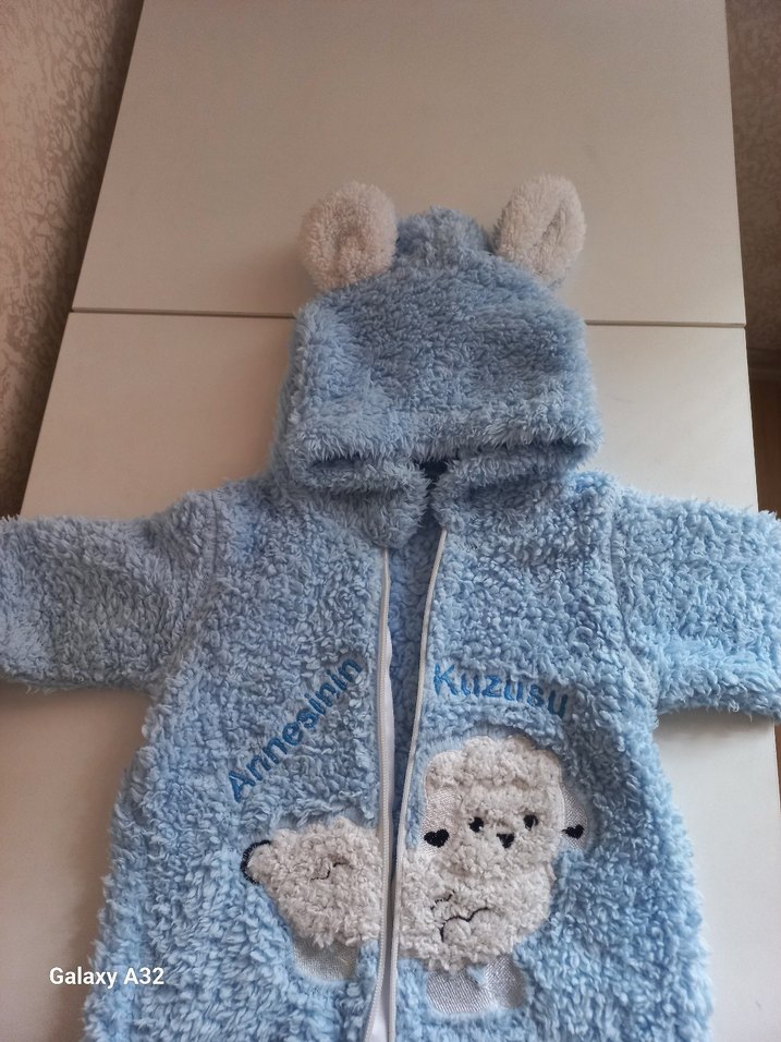 Yumuşak ve sıcak kumaştan yapılmış, kulaklı kapüşonlu, nakışlı ve kürklü detaylı mavi erkek bebek tulumu. Önden fermuarlı.