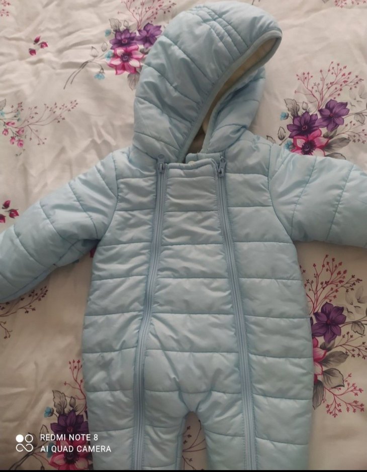 Pastel mavi renkte, kapüşonlu ve kürk detaylı, yumuşak ve sıcak peluş kumaştan yapılmış bebek tulumu. ❄️