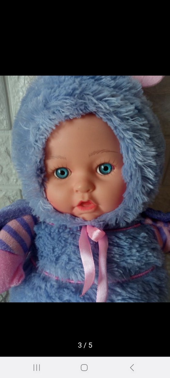 Canlı mavi gözlü, yumuşak peluş kumaştan yapılmış pastel mavi renkli bebek. Üzerinde pembe kurdele detaylı, rahat ve kabarık giysi bulunur. konuşan şarkı söyleyen çok eğlenceli bebek