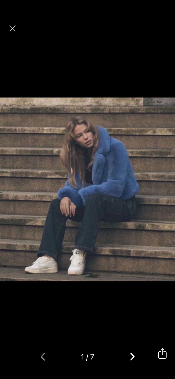 Mavi renkte, peluş detaylı, uzun kollu ve yüksek yakalı bol kesim midi uzunluğunda suni kürk ceket. Günlük kullanıma uygun pastel tonlarda.