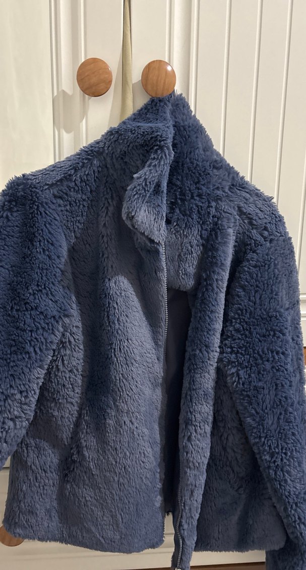 Mavi renkli, peluş dokulu ve kürk detaylı hamile kabanı. Notlu yakalı, uzun kollu ve bol kesim midi boyda, günlük kullanıma uygun.