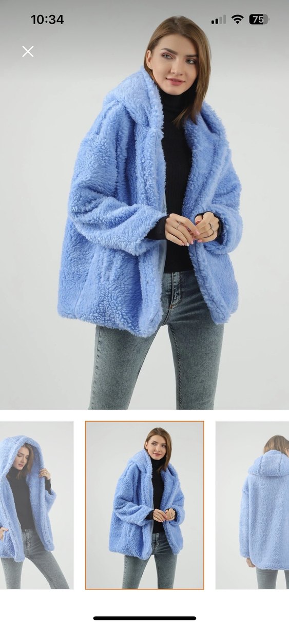Bu bol kesim, pastel mavi peluş kaban, kesik yakalı ve uzun kolludur. Yumuşak, peluş dokusuyla günlük rahat kullanıma uygundur.