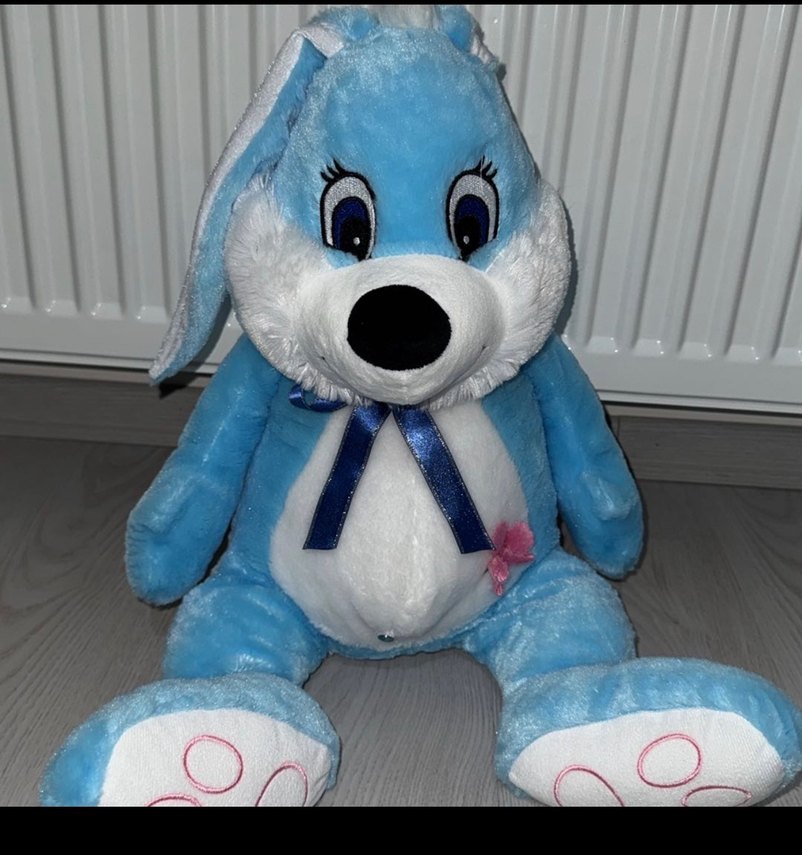 Yumuşak pastel mavi renkli, beyaz karınlı ve boynunda mavi kurdele bulunan peluş tavşan oyuncak. Patilerinde pembe detaylar var. 70 cm