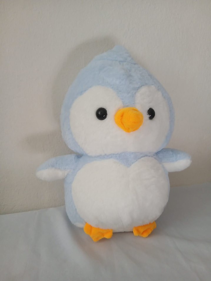 Yumuşak pastel mavi ve beyaz peluş penguen, turuncu gagalı ve ayaklı. Sarılmalık oyuncak.