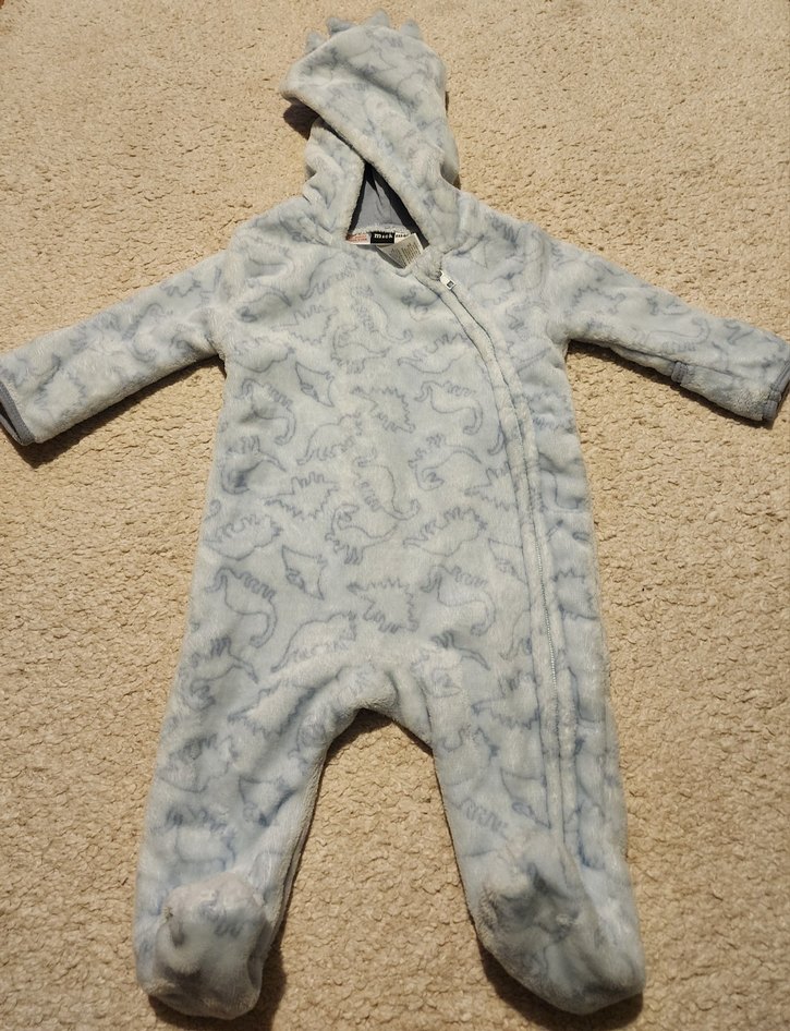 Mavi renk, dinazor desenli ve kapüşonlu, tam fermuarlı, yumuşak ve sıcak kumaştan yapılmış bebek peluş tulum. İngiltere'nin meşhur Mick&Mack markası, Londra'dan almıştım. 3-6 ay arası için uygun