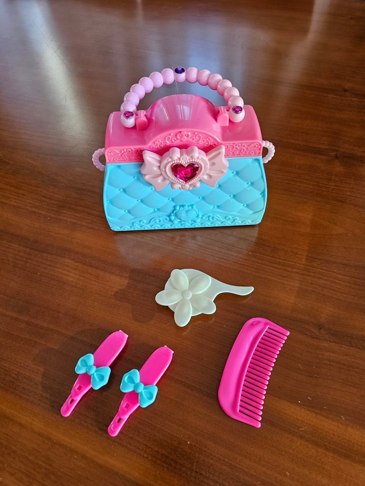 Mavi pembe plastik kulplu, fiyonk kilitli çanta. Çanta içinde iki toka, bir tarak, bir fırça bulunmaktadır.