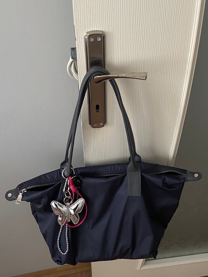 Sentetik kumaştan mavi kadın el çantası, püskül detayı ve kelebek aksesuarı ile sokak modasına uygun, günlük kullanıma ideal.