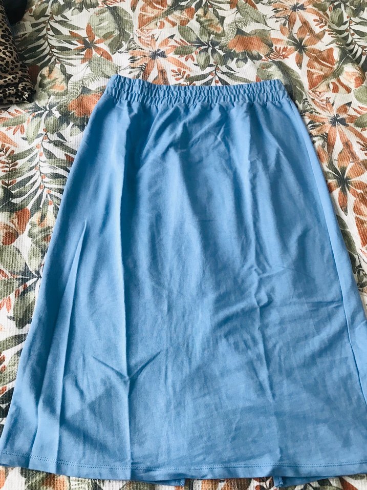 Mavi renkte, likralı prnta arkası yıtmaçlı spor midi boyda hamile eteği. Rahat kesimi ve yumuşak sentetik kumaşıyla bohem ve retro tarzına uygundur.