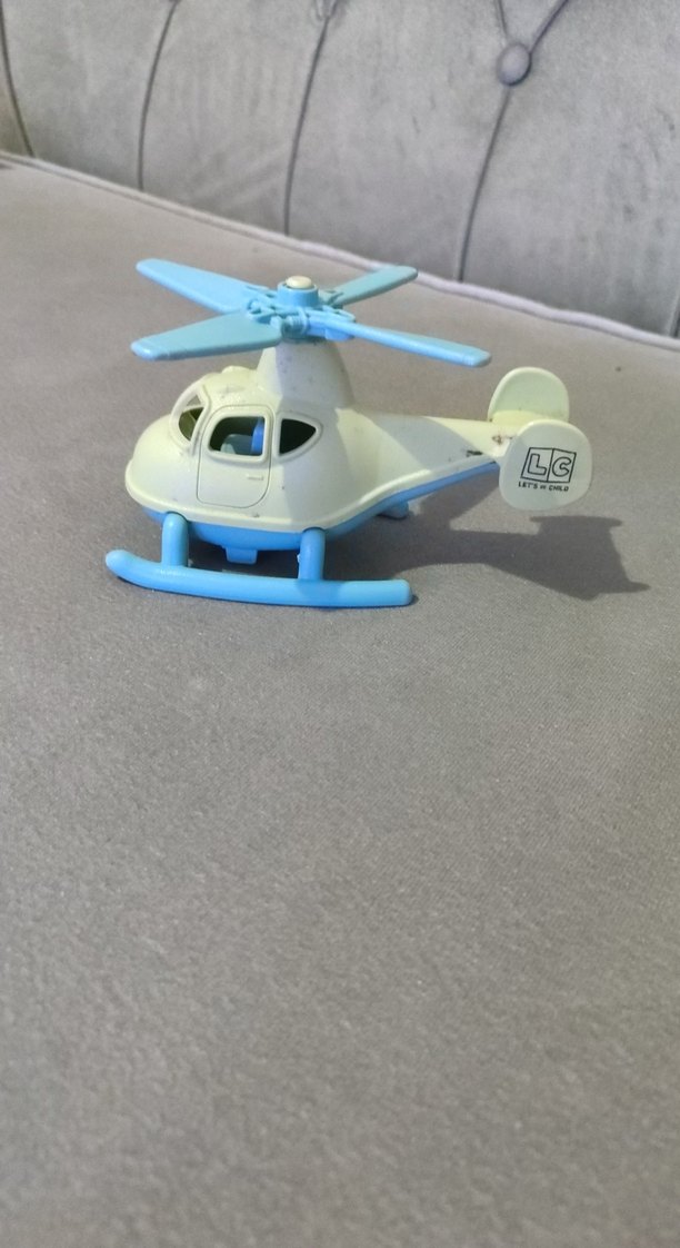 Açık mavi pervaneleri ve iniş ayakları olan beyaz oyuncak helikopter, küçük pencereleri ve kompakt tasarımıyla dikkat çekiyor. ✈️