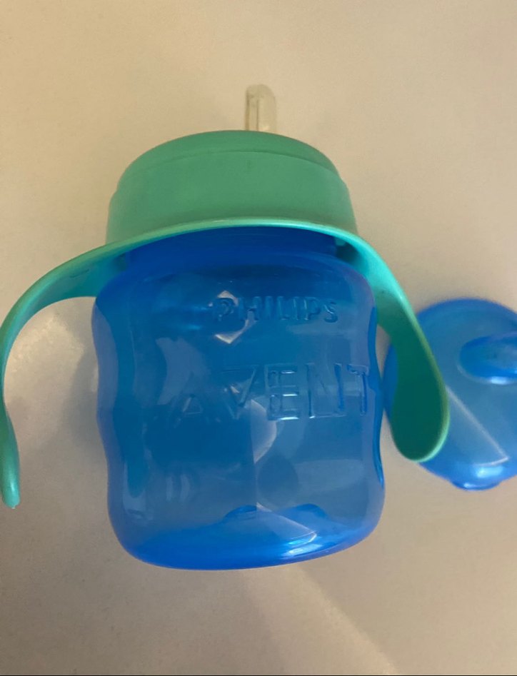 Mavi Philips Avent bebek bardağı, kolay içim için kulplu ve yumuşak ağızlıklı. Ağız kısmında yarık var.