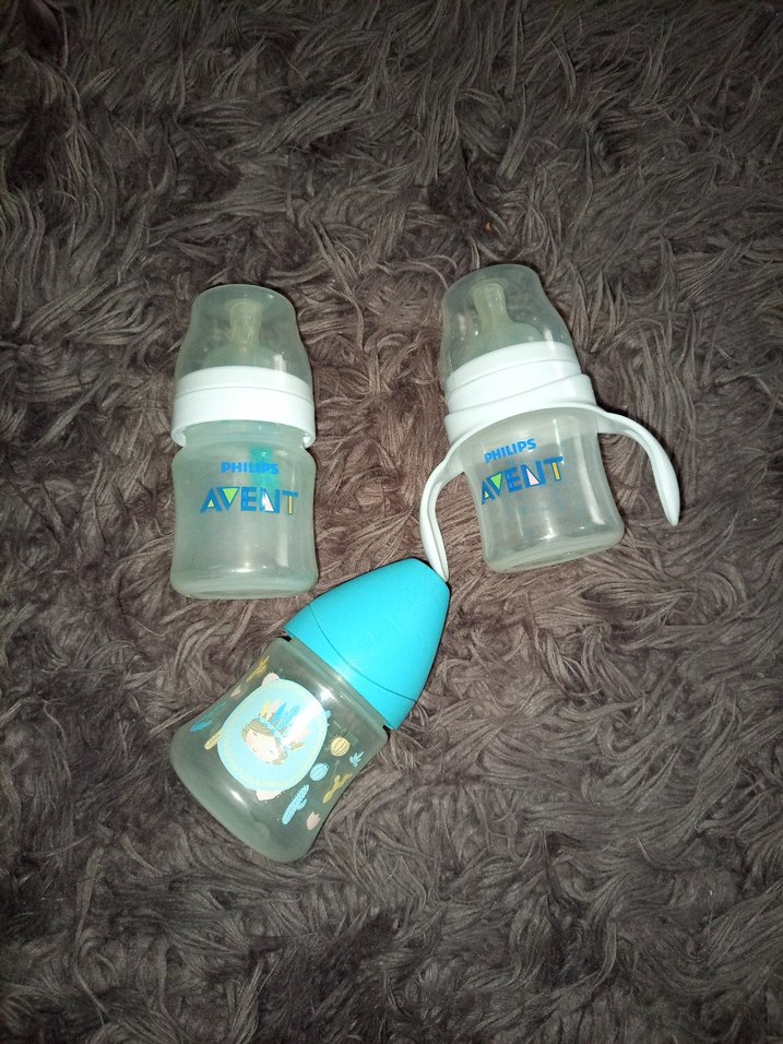Pastel mavi renkli üç Philips Avent bebek biberonu, kolay tutulabilen tasarım ve ölçü işaretlerine sahip. Bebek besleme için uygundur.