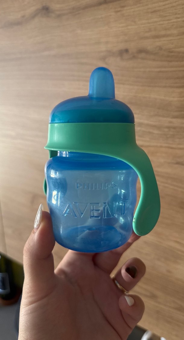 Renkli mavi gövdeli, yeşil saplı ve kapaklı Philips Avent bebek biberonu, kolay tutuş ve besleme sağlar. 1 ay kullanıldı temiz