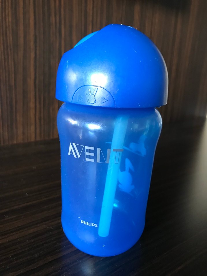 Renkli tasarımlı mavi Philips Avent bebek pipetli suluk , koruyucu kapaklıdır ve kolay beslenme sağlar.