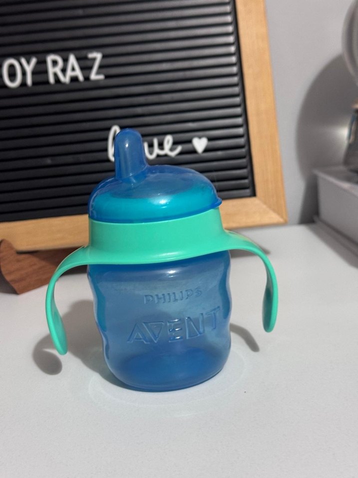 Renkli mavi Philips Avent bebek suluk, kolay içim için kulplu ve yumuşak ağızlıdır. Küçük çocuklar için uygundur.