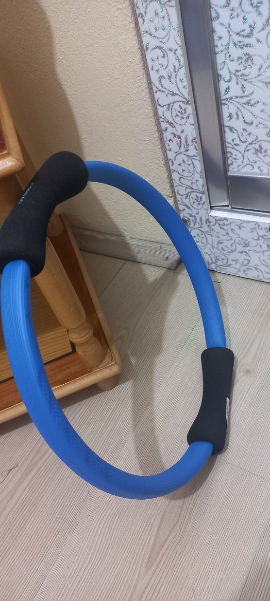 Mavi pilates çemberi, yumuşak köpük saplarla rahat tutuş sağlar. Desensiz ve renkli tasarıma sahiptir. ♀️