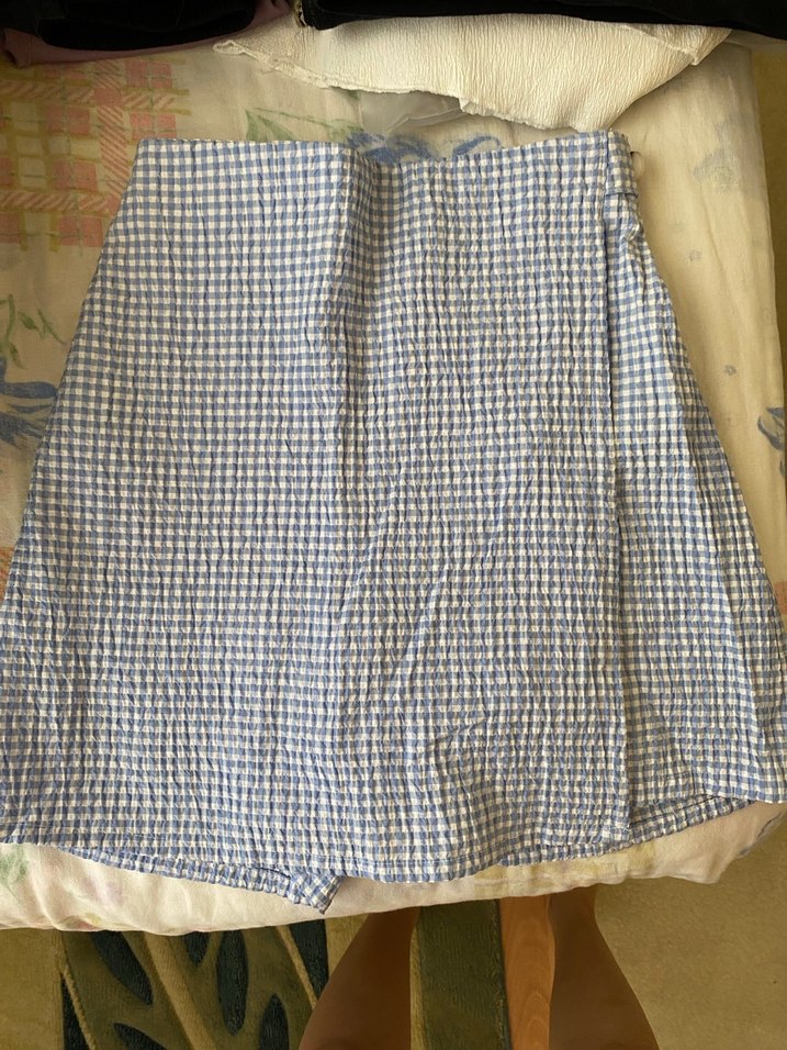 Mavi renkli, keten kumaştan yapılmış, pileli ve bol kesim midi etek. Bohem ve sokak stiline uygun, pastel tonlarda rahat bir parça.