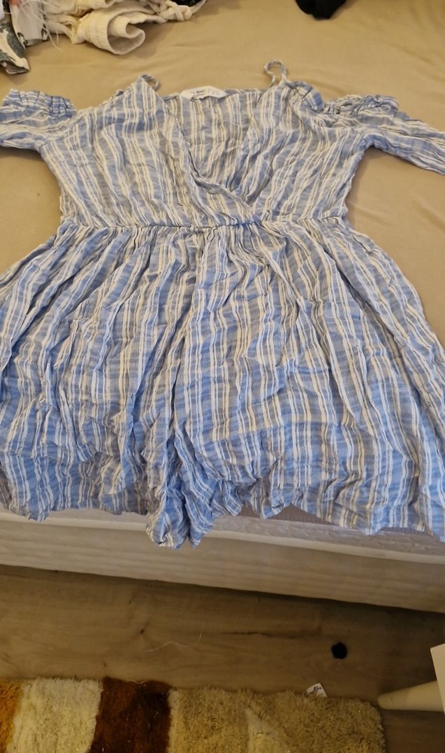 Mavi keten midi şortlu elbise, bol kesim ve pileli detaylara sahiptir. Kısa kollu ve tekne yaka tasarımıyla bohem tarzını yansıtır. Rahat kullanım için uygundur.