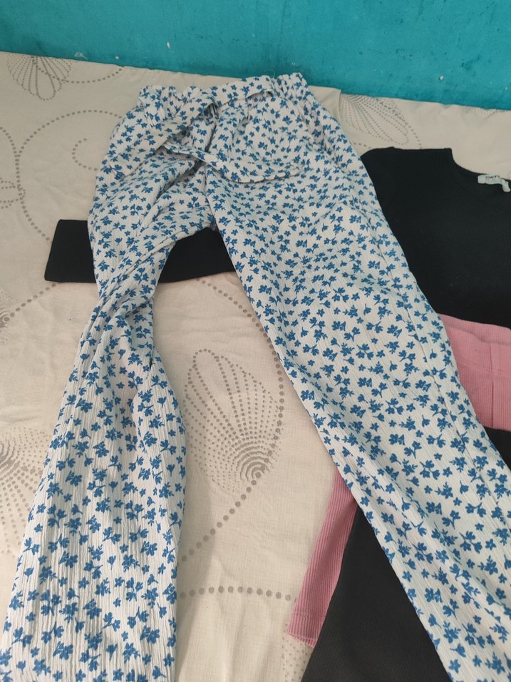 Pastel mavi çiçek desenli, pileli, normal boy, çocuk kumaş pantolon, rahat günlük ve sokak stiline uygun.