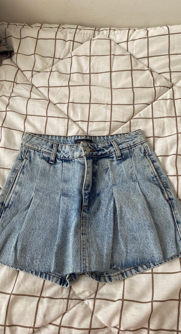 Mavi renkte, pileli detaylara sahip, bol kesim midi kot şort. Günlük kullanıma uygun, rahat ve desen içermeyen tasarım.