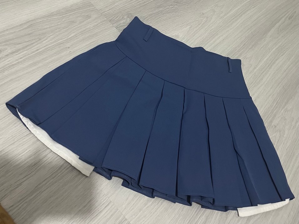 Mavi renkli, pileli ve vücuda oturan bu mini etek, sentetik kumaştan olup günlük sokak stiline uygun minimal bir tasarıma sahiptir.