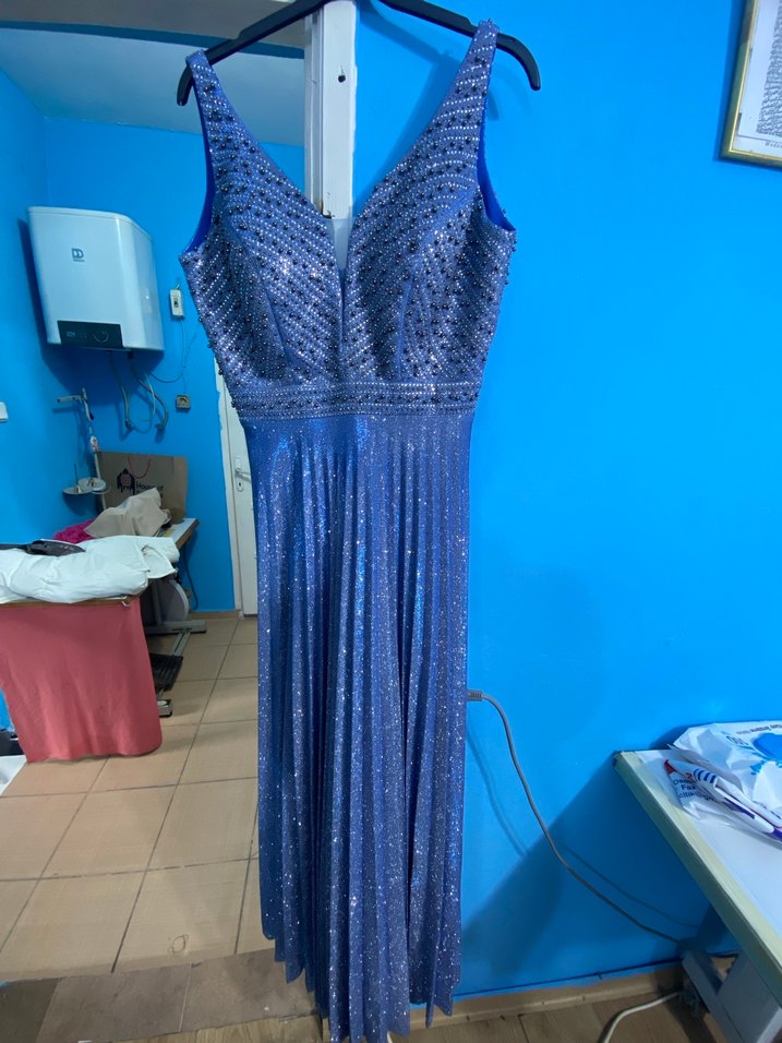 Mavi renkli, pileli detaylı, V yaka ve kolsuz uzun abiye elbise. Parlak dokusu ve klasik şıklığıyla partiler için uygun. ✨ kendi dikimimiz ve tasarımımızdır.