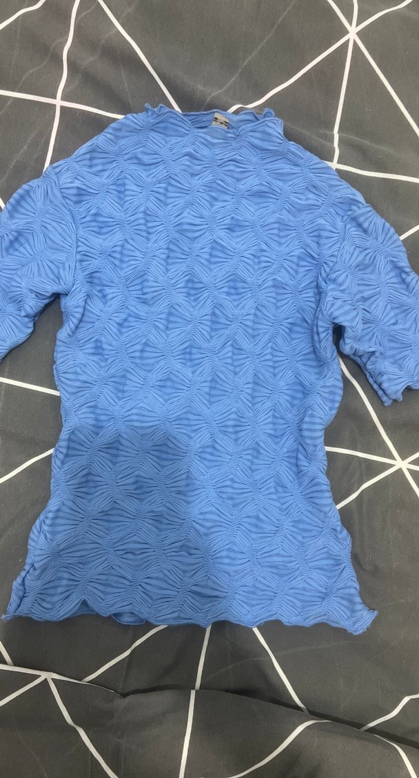 Mavi pastel tonlarda, kısa kollu, balıkçı yakalı, pilili detaylı S beden