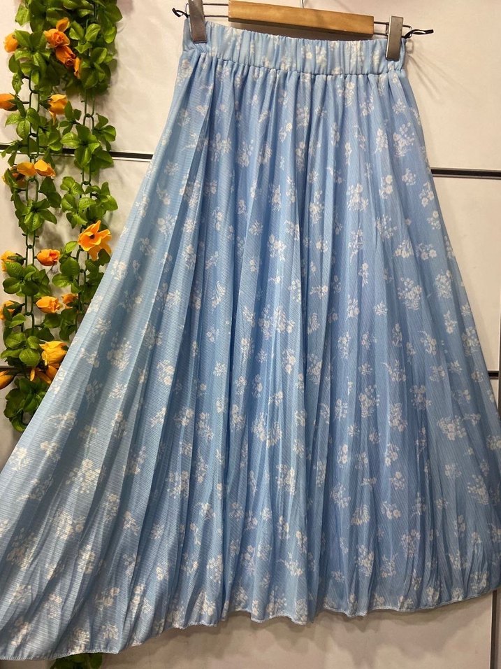 Mavi renkli, pilili ve bol kesim uzun etek, yumuşak sentetik kumaştan, pastel tonlarda tie-dye deseniyle bohem tarzı için uygundur.