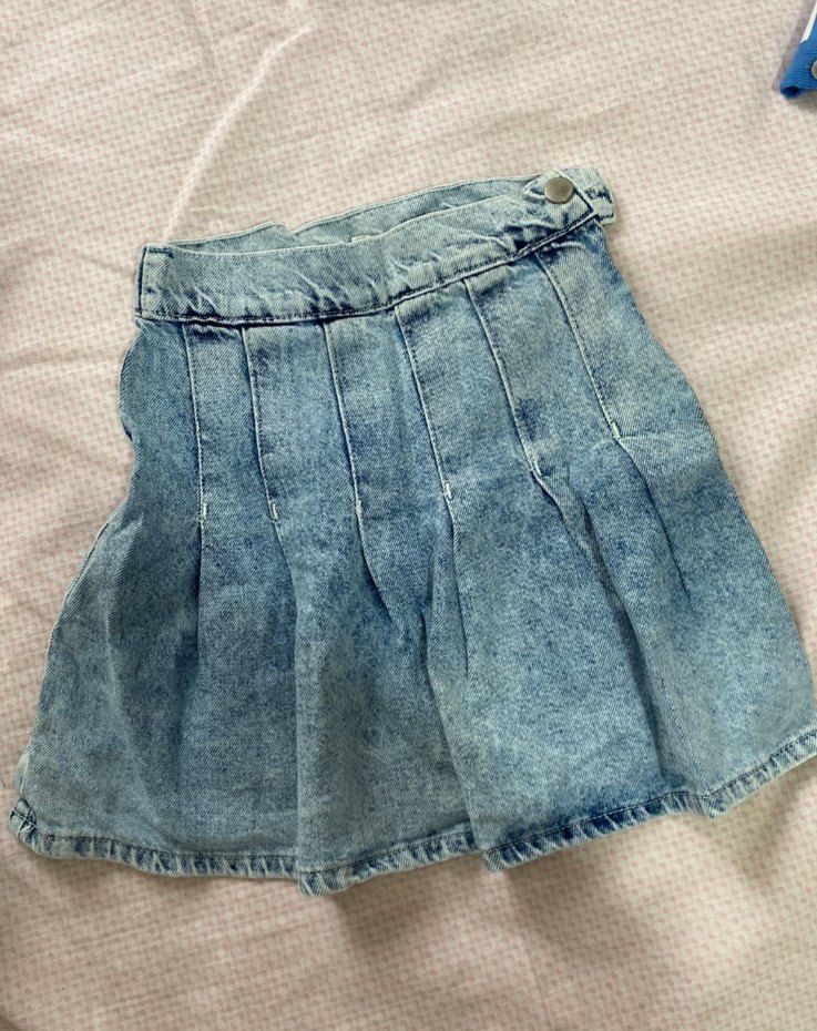 Mavi renkte, pilili ve bol kesim denim midi etek, pastel tonlarda ve günlük kullanıma uygun.