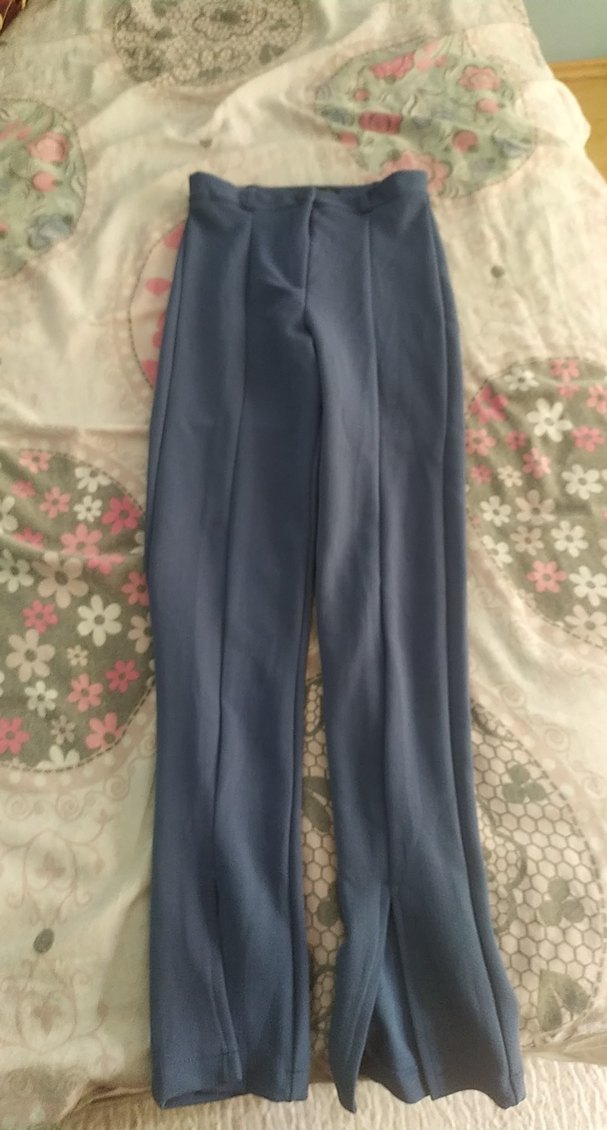 Mavi, uzun paça, pilili kadın kumaş pantolon. Rahat kalıp ve sentetik kumaştan üretilmiştir. Ofis ve günlük iş ortamı için uygundur.