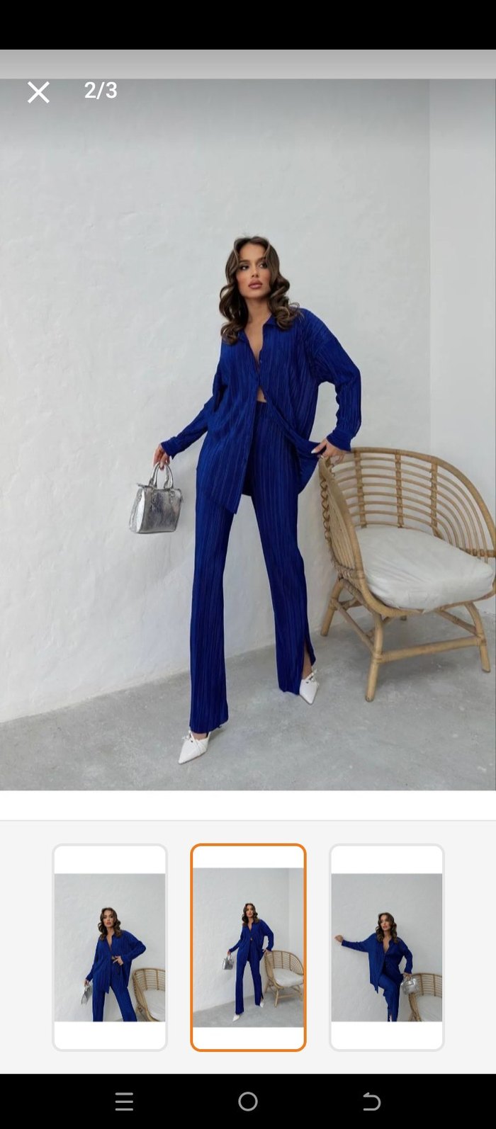 Mavi renkli, pilili ve parlak sentetik kumaştan üretilmiş, uzun kollu, kesik yakalı, regular fit kadın ofis takımı.