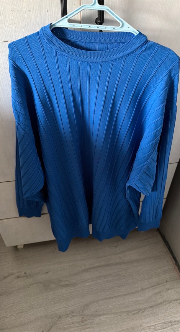 Pilili tasarıma sahip, uzun kollu ve yuvarlak yakalı mavi kadın trikosudur. Yumuşak sentetik kumaştan yapılmış, bol kesim ve normal boyda, günlük rahat kullanım için uygundur.