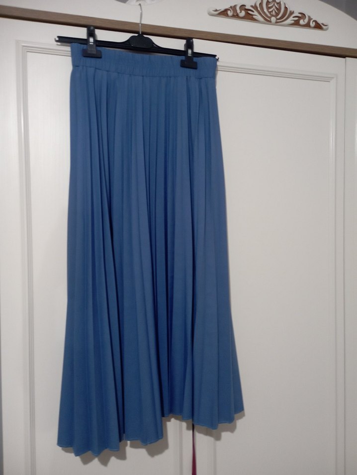 Mavi uzun etek, pilili ve bol kesimdir. Pürüzsüz sentetik kumaştan yapılmıştır. Minimalist ve bohem tarzlara uygundur, günlük kullanıma idealdir.