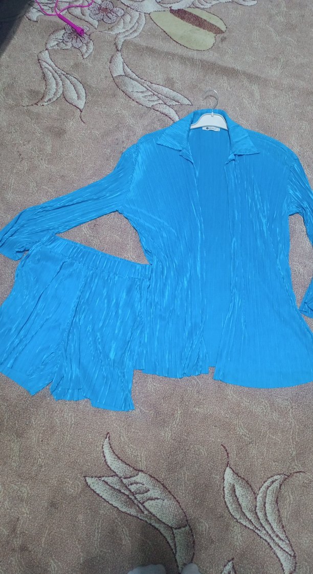 Parlak mavi keten kumaştan, pilili dokulu, uzun kollu, notched yakalı, bol kesim kadın takımı. Parti için uygundur.