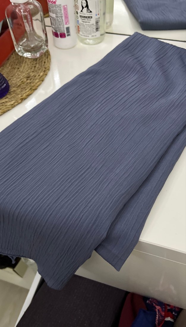 Yumuşak keten kumaştan, gri-mavi tonunda kadın şal. Pilili dokusu ile rahat ve sade bir görünüm sunar.