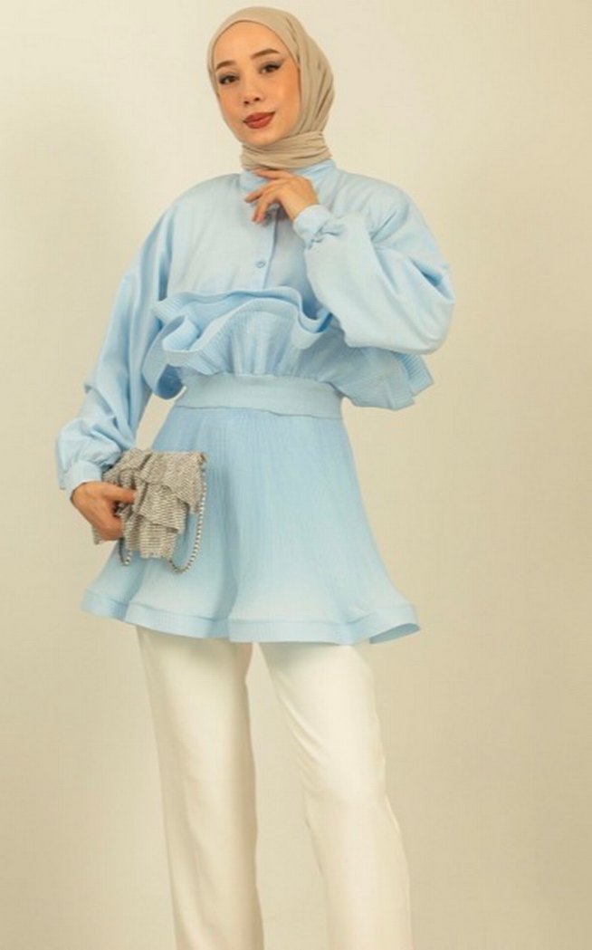 Bol kesim, kısa boylu mavi keten bluz, uzun kollu ve yüksek yakalıdır. Pastel tonlarda tie-dye desenli, pilili detaylara sahiptir. Günlük kullanıma uygundur.