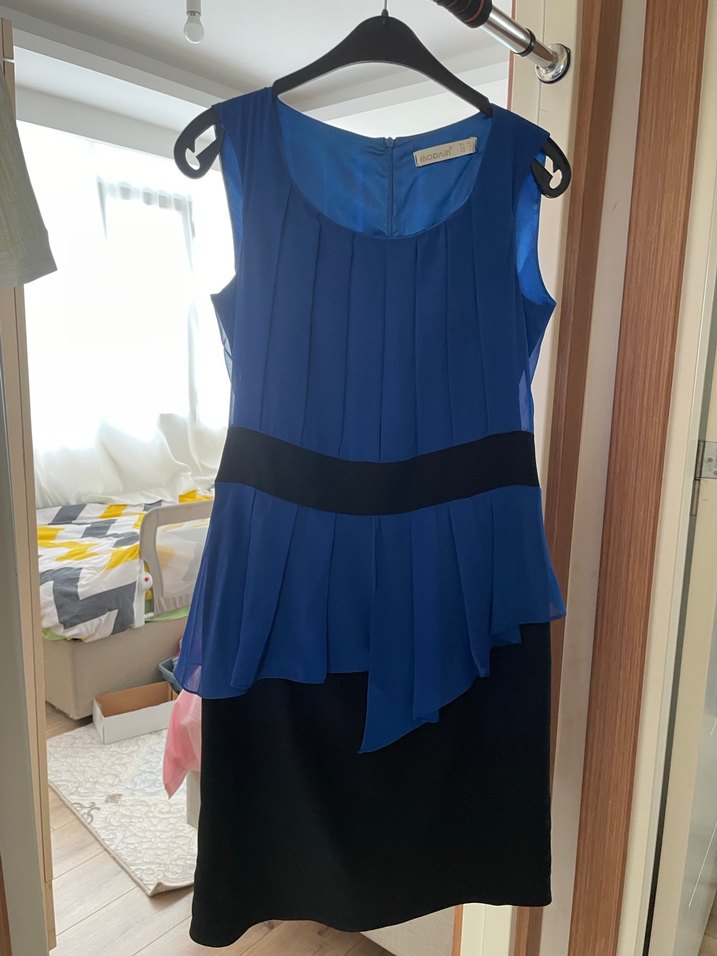 Koyu mavi renkli, pilili ve kolsuz elbise.Yuvarlak yakalı, belde siyah bantlı, astarı var, küçük bir yırtmacı var. 40 beden. 170 boy 67-68 kilo iken giyerdim tam güzel olurdu.