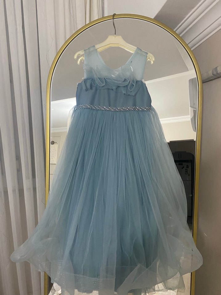 Mavi, kolsuz ve straplez yakalı bu elbise yumuşak sentetik kumaştan, pilili tasarımlı ve ince taşlı bel detayıyla moda düşkünü çocuklar için uygun. Küçük bir defosu var ama belli olmuyor onun için uygun fiyata koyuyorum.