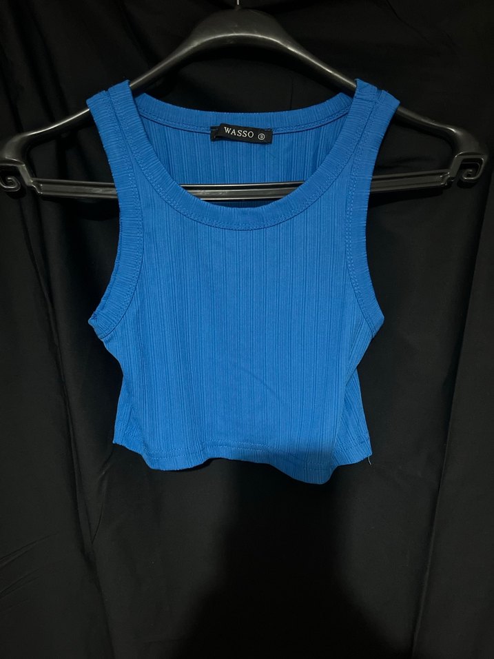 Dar kesim, kolsuz mini atlet, yuvarlak yaka ve pilili dokusuyla dikkat çeker. Sentetik kumaştan yapılmış, koyu mavi renktedir.