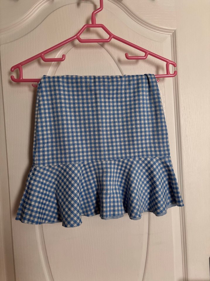 Sentetik kumaştan yapılmış, pilili ve mavi kareli desene sahip, fitted kesim midi etek.