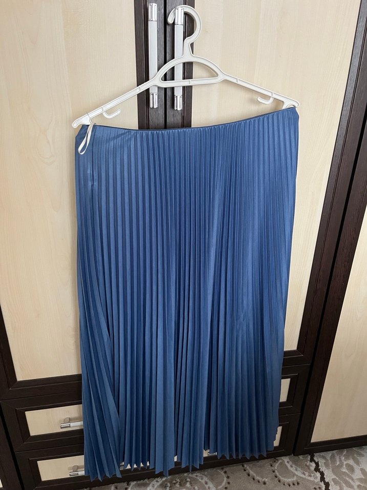 Mavi renkli, sentetik kumaştan pilili midi boy, bol kesim etek. Minimalist tasarımı günlük kullanıma uygundur.