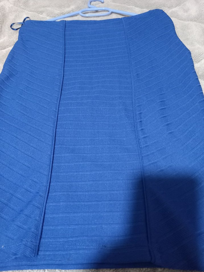 Bu mavi parlak hamile eteği, pilili detaylara sahip, vücuda oturan ve normal midi uzunluktadır. Sentetik kumaştan üretilmiştir ve dış mekan kullanımı için uygundur.