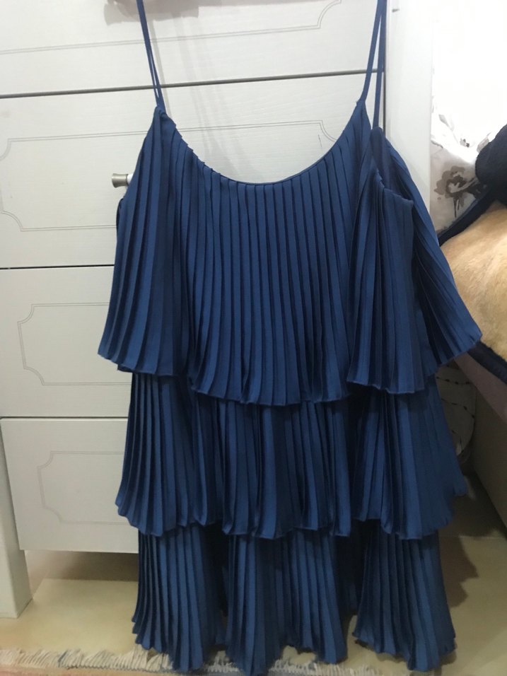 Mavi pilili katmanlara sahip, askılı ve salaş kesimli kadın abiye bluz. Askılı. Sadece 1 kez sahnede giyildi. Çok şık