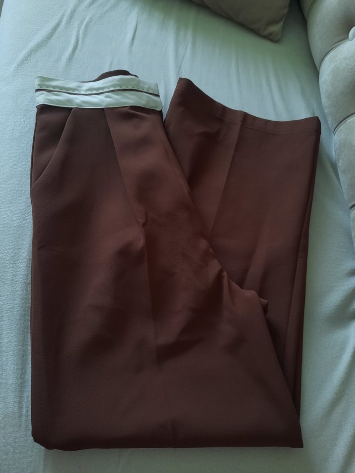 Kahve renkli, pilili ve midi boyda kadın kumaş pantolon. Düz kesimli, sentetik yumuşak kumaştan, ofis kullanımına uygun minimal tarzda. ✨