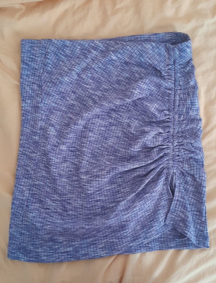 Yumuşak keten kumaştan, mavi-gri tonlarında, pilili ve bol kesim midi etek. Günlük sokak stiline uygun rahat bir parça.